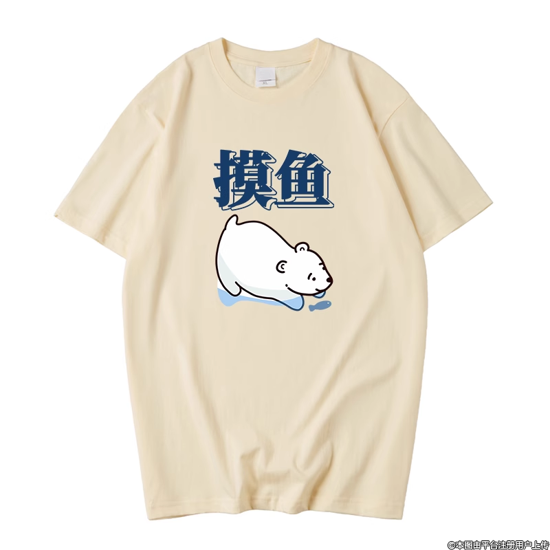 北极熊卡通图案T恤,结合“熊熊摸鱼”的主题,可以设计成一种既可爱又有趣的创意服饰。以下是一些可能的设计示例: